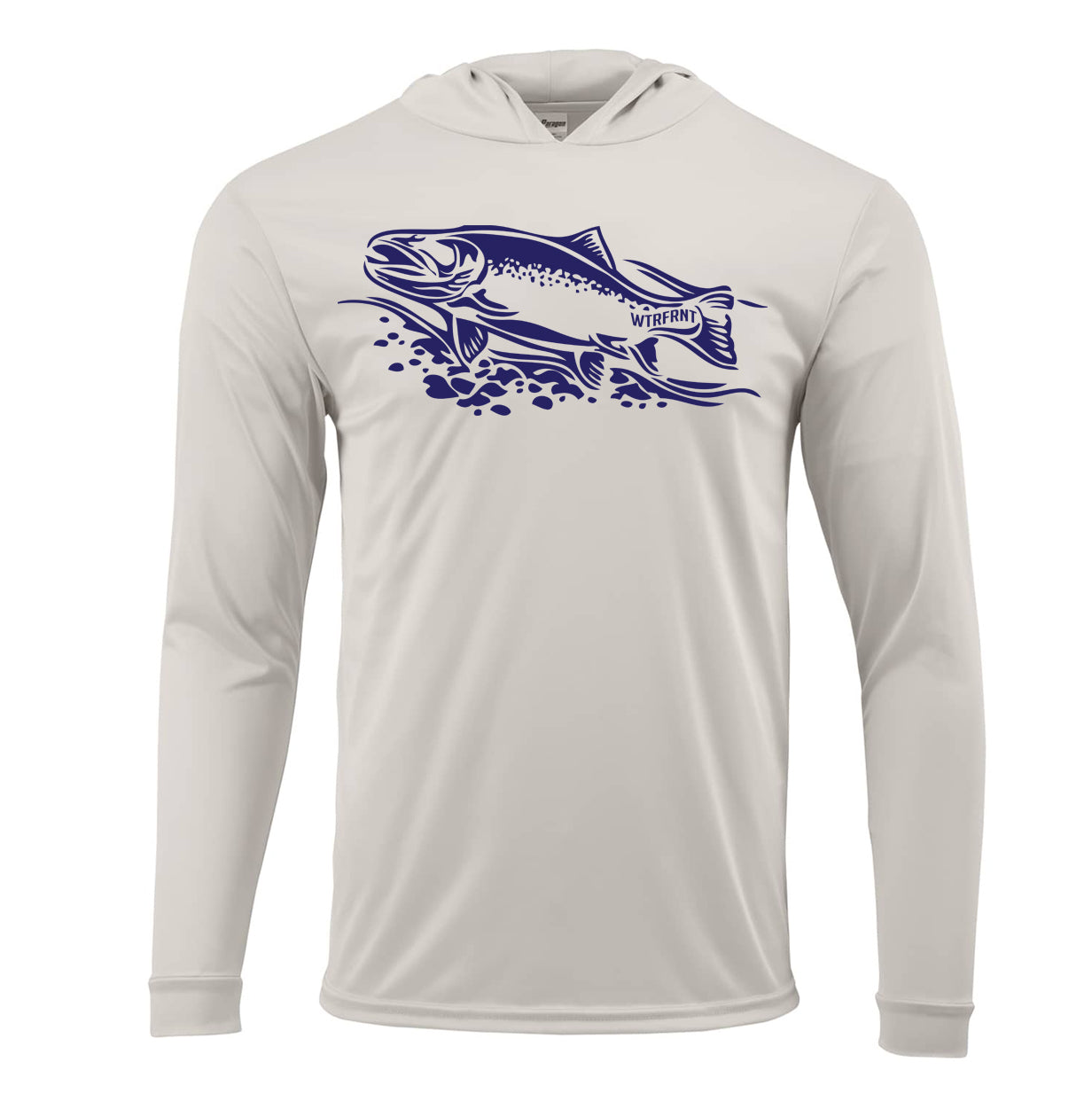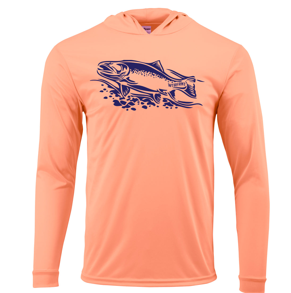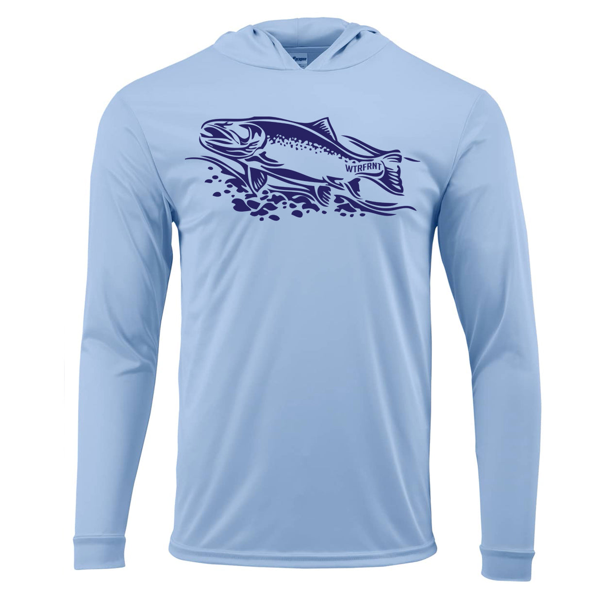The comfort of a tee and the protection of a hoodie featuring the navy trout design. UPF50+ sun protection microfiber performance polyester with antimicrobial finish, moisture management and a unisex fit.